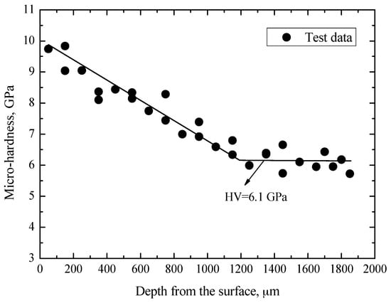 Along the direction from the edge to the center of the cross-section of the specimen, the Vickers hardness (HV) of carburized layer and matrix region was measured by using a Nano-indenter G200 (Agilent Technologies, Santa Clara, CA, USA), and its distribution as a function of the depth from the surface is shown in Figure 3. Apparently, the values of HV first have a decreasing tendency with the increasing of the layer depth, and then reach a constant value at a depth exceeding about 1200 μm. Basically, the values of HV are about 9.9 GPa at the near surface and are about 6.1 GPa in the matrix. Thus, it can be concluded that the thickness of the carburized layer is about 1200 μm.
