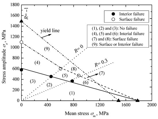 where is the cyclic yield strength, but it can be replaced by σy as an approximation []. A thick dash-dot-dot line in Figure 5 indicates the relevant yield line. Therefore, combined with the established constant life lines for surface and interior failures, as well as the constant stress ratio lines for R = 0 and 0.3 indicated by dot lines in Figure 5, the total zone under this yield line can be divided into nine small zones. If the applied stress amplitude and mean stress fall in the zones of 1, 2, and 3, the fatigue failure and yield phenomenon do not occur within the 108 cycles. If they fall in the zones of 4, 5, and 6, the interior failure is the predominant failure mode and surface failure almost does not occur. If they fall in zones 7 and 8, surface failure is predominant and interior failure almost does not occur. If they fall in zone 9, both the surface failure and the interior failure all can occur. However, it should be noted that with the decrease of tensile mean stress, the probability for interior failure tends to increase.