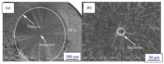 Furthermore, from Figure 6d,f,h, it can be seen that with increasing stress ratio, the FGA morphology becomes vague and the FGA size approximately tends to decrease. Especially under R = 0.3, the FGA is hard to distinguish. This reveals that increasing stress ratio, i.e., decreasing of compressive stress and stress amplitude, may restrain FGA formation. In general, the fracture surface without FGA can be divided into three areas: (i) inclusion; (ii) fisheye; (iii) momentary fracture area (MFA), as shown in Figure 6a. The fracture surface with FGA can be divided into four areas: (i) inclusion; (ii) FGA; (iii) fisheye, and (iv) MFA, as shown in Figure 6c or e.