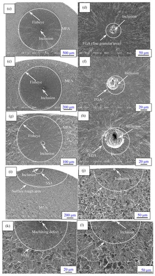 Observation of fracture surfaces: (a) Fisheye (σa = 800 MPa, Nf = 370,800 cycles, R = −1); (b) Inclusion without fine granular area (FGA) (σa = 575 MPa, Nf = 4,254,700 cycles, R = 0); (c) Fisheye (σa = 700 MPa, Nf = 4,768,700 cycles, R = −1); (d) Inclusion with FGA (σa = 700 MPa, Nf = 4,768,700 cycles, R = −1); (e) Fisheye (σa = 575 MPa, Nf = 4,254,700 cycles, R = 0); (f) Inclusion with FGA (σa = 575 MPa, Nf = 4,254,700 cycles, R = 0); (g) Fisheye (σa = 455 MPa, Nf = 9,494,900 cycles, R = 0.3); (h) Inclusion with FGA (σa = 455 MPa, Nf = 9,494,900 cycles, R = 0.3); (i) Surface failure (σa = 650 MPa, Nf = 82,100 cycles, R = 0); (j) Inclusion (σa = 650 MPa, Nf = 82,100 cycles, R = 0); (k) Surface machining defect (σa = 600 MPa, Nf = 1,945,900 cycles, R = 0); (l) Inclusion (σa = 490 MPa, Nf = 100,200 cycles, R = 0.3).