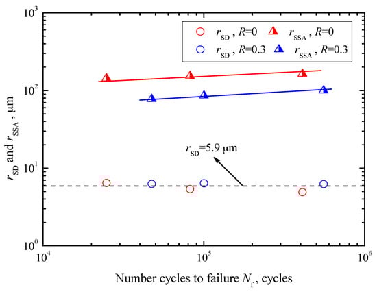 On the other hand, the relationships between rSD and rSSA, and Nf under these three stress ratios are shown in Figure 9. The values of rSD are scattered throughout 4.9–6.5 μm with an average value of 5.9 μm, independent of fatigue life and stress ratio, as denoted by a dashed line in Figure 9. Apparently, surface defects are mainly dependent on the machining process. Moreover, the values of rSSA tend to increase with increasing fatigue life at each stress ratio, indicated by solid lines with different colors in Figure 9. The values of rSSA under R = 0 are scattered in the range of 143.3–163.4 μm, while those under R = 0.3 are scatted in the range of 77.7–99.9 μm. By contrast, the sizes of SSA under R = 0 are obviously larger at a certain fatigue life.