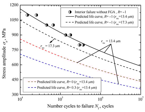 For interior failure without FGA, combined with the sizes of inclusion and the relevant S-N data for R = −1, the values of Cint and mint in Equation (24) were evaluated to be 3.75 × 10−25 and 15.73 respectively. Corresponding to the mean value and the maximum value of rinc, about 13.4 μm and 17.3 μm, the predicted crack growth life curves for R = −1 are indicated by a solid line and a dashed line in Figure 14, respectively. It can be found that the predicted curves all exhibit a continuously descending trend, which is consistent with the variation trend of the experimental data. Especially, the predicted curve associated with the maximum inclusion size indicates well the lower boundary of the data. Based on this, and by using Equation (25), the crack growth curves associated with the mean inclusion size under stress ratios of 0 and 0.3 is plotted by a red dashed line and a blue dashed line in Figure 14, respectively.
