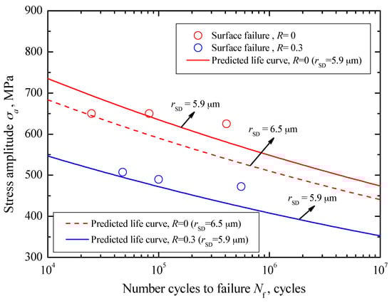 For surface failure, combined with the sizes of SD and the relevant S-N data for R = 0, the values of Csur and msur in Equation (26) were evaluated to be 3.75 × 10−23 and 12.28, respectively. Corresponding to the mean value and the maximum value of rSD, about 5.9 μm and 6.5 μm, the predicted crack growth life curves for R = 0 are indicated by a solid line and a dashed line in Figure 15, respectively. Similarly, based on the evaluated results for R = 0, the crack growth life curve corresponding to the mean value of rSD for R = 0.3 is plotted by a dotted line in Figure 15. They all reflect well the variation trend of the experimental data.