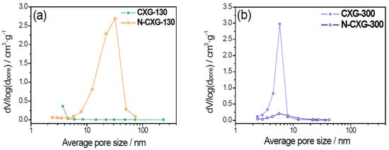 Pore size distribution (PSD), as shown in Figure 1, corroborates the different effect of introducing melamine depending on the R/C ratio. When R/C is low, N-doping enhances the development of the porous structure. N-CXG-130 has a PSD centered around 30–40 nm. On the other hand, when R/C is high, the introduction of N leads to the collapse of the porous structure and to a lower pore size, being PSD centered around 5–6 nm for N-CXG-300.