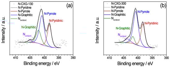 The nature of the nitrogen functionalities for N-CXGs was investigated by X-ray photoelectron spectroscopy (XPS). N1s spectra were deconvoluted, as described in [30] into four components, as shown in Figure 2, considering the binding energy values detailed in Table 3.