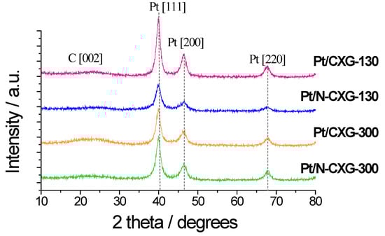 Catalysts with a 20 wt % of Pt loading were obtained using both bare (CXGs) and N-doped carbon xerogels (N-CXGs) as support. The synthesis method consisted of an impregnation and reduction with formic acid [64,65]. A 2 M solution of formic acid (Panreac) was pre-heated at 80 °C. Then, the carbon material was dispersed in this solution under stirring. Subsequently, an aqueous solution of the metallic precursor, H2PtCl6 (Sigma-Aldrich, Madrid, Spain) in 4 mM concentration, was added dropwise and stirred for 1 h at 80 °C. Once the mixture cooled down, it was filtered and washed with deionized water. The obtained powder was dried overnight.