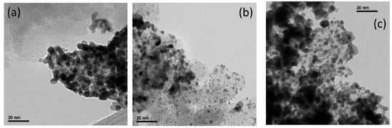 Figure 4 shows representative TEM micrographs for Pt/CXG catalysts. Pt/CXG-130, Figure 4a, presents some inhomogeneities in Pt particles distribution on the CXG-130 support, including Pt particle agglomerates and small uncatalyzed xerogel regions, due to the preferential growth of metal particles on support defects. The morphology of the CXG-130 xerogel is indeed very compact and dense, consistent with its microporous structure, as previously discussed regarding nitrogen physisorption measurements. Large microporosity, and thus low mesopores availability for Pt deposition, is most probably responsible for the observed poor metal dispersion. The catalyst Pt/N-CXG-130, shown in Figure 4b, presents a better Pt nanoparticle distribution on the xerogel surface, as a consequence of the support’s larger surface area and pores, with Pt particles of uniform size. Finally, the Pt/N-CXG-300 catalyst, as shown in Figure 4c, also showed well-distributed areas together with the presence of some agglomerations and clusters of particles.