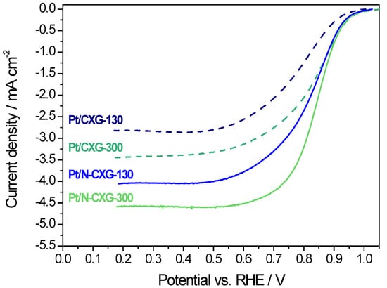 The electrocatalytic activity of CXG-supported Pt catalysts was evaluated in a half-cell fitted with a rotating disk electrode (RDE). Catalysts were deposited as a thin film on the surface of the glassy carbon maintaining the Pt loading in all experiments (50 μg·cm−2), see details in the experimental section. Figure 5 shows the linear sweep voltammetries (LSV) obtained at 1600 rpm in an O2-saturated 0.5 M H2SO4 solution. The positive effect of N-doping is clearly evidenced in the figure. Both Pt/N-CXGs catalysts present better onset and half-wave potentials than their respective undoped counterparts. Moreover, better catalytic behavior is also accompanied by a higher limiting current density, indicating a reduction process approaching 4e- pathway. Among Pt/N-CXGs catalysts, the one supported on N-CXG-300 is more active for the oxygen reduction reaction (ORR) in terms of both limiting current density and onset potential.