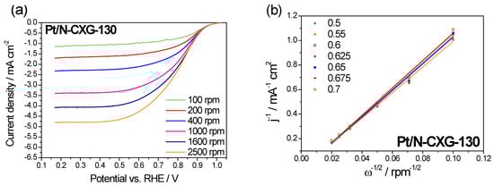 The ORR catalytic pathway for Pt/N-CXGs catalysts was investigated by Koutecky–Levich (K-L) plots obtained from the LSV at various rotating speeds (100–2500 rpm), shown in Figure 6 and Figure 7. Figure 6a and Figure 7a show how the cathodic current increases when increasing the rotating speed. This is due to an improved oxygen mass transport at the electrode surface.