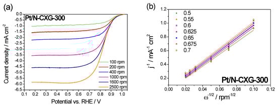 (a) Linear sweep voltammetries (LSV) curves for Pt/N-CXG-300 at different rotation rates recorded in a 0.5 M H2SO4 O2-saturated solution. Scan rate: 5 mV·s−1; (b) Koutecky-Levich plots for Pt/N-CXG-300 at different potentials. The legend refers to potential values (V vs. RHE).
