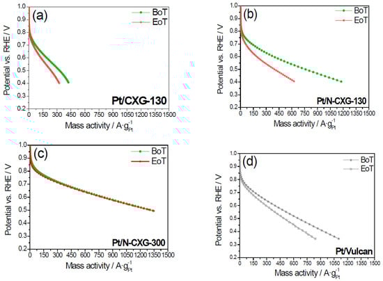 Pt/N-CXGs were also investigated in a gas diffusion electrode (GDE) in a half-cell configuration and a low Pt loading (0.1 mg·cm−2) in order to assess their stability and performance under conditions more similar to a practical application. The catalysts were subjected to a 1000 cycles between 0.6 and 1.2 V vs. RHE of potential. Figure 6 shows the polarization curves at the beginning and at the end of the stress test (BoT and EoT, respectively). As evidenced in Figure 8a,b, the catalyst based on the N-doped CXG (Pt/N-CXG-130) presents a decay of performance of about 45%, which is larger that the decay obtained with its un-doped counterpart, of about 30% (Pt/CXG-130). These catalysts present similar physico-chemical features, i.e., similar support BET surface area, a parameter that greatly influences the resistance towards degradation. On the other hand, Pt/N-CXG-130 presents a lower Pt crystal size (4.3 nm vs. 5.9 nm for the Pt/CXG-130), which may also contribute to its lower stability [32]. On the other hand, Pt/N-CXG-300 (Figure 8c) presents almost the same performance at the beginning and at the end of the 1000 cycles. Compared with the Pt/N-CXG-130, presenting a higher decay of performance, this catalyst is supported on N-CXG-130, with a higher specific surface area compared to the N-CXG-300 support (500 m2·g−1 vs. 390 m2·g−1). The higher the surface area the faster the oxidation of carbon, which may have led to a higher corrosion of the CXG-130, and N-CXG-130 supported catalysts but it does not explain itself the excellent stability for Pt/N-CXG-300.