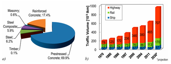 As an essential part for the national infrastructure, the German Federal Highway System comprises about 39,000 bridge structures. In terms of the bridge deck area, almost 90% of these bridges are made of reinforced or pre-stressed concrete [1] (Figure 1a). The traffic volume on these bridges has been increasing over the past decades, particularly concerning heavy goods traffic [2,3], and is expected to further increase in the future [4] (Figure 1b). Especially, abnormal traffic loads and unapproved excessive charges lead to bridges loaded to their design capacity or beyond [5].