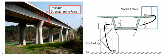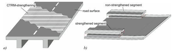 (a) Possible are of CTRM strengthening (image edited by the authors, “A71-Thalwassertalbruecke”, author: Störfix, licensed under CC BY-SA 3.0); and (b) the application method.
