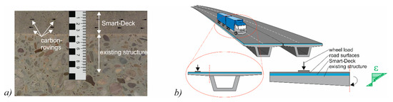 With respect to bridge deck slabs, the CTRM layer is called Smart-Deck, as it combines the following three features: all-over real-time humidity monitoring, a preventive cathodic corrosion protection (CCP), and a strengthening effect in the transverse direction of the bridge. Smart-Deck is applied between the surface of the reinforced concrete bridge deck slab and the road surface (Figure 2a). It is installed in segments to obtain defined sectors in the longitudinal direction, which allows for locating possible leaks in the road surface. The monitoring function provides the detection of leaks at an early stage long before severe damage occurs. Due to the possibility of engaging the CCP, the replacement of the damaged road surface can be postponed and realized in convenient periods of low traffic. This allows for an adequate planning horizon and, thus, lower expenses. The bending and strengthening effect of Smart-Deck counteracts the increase in traffic volume and, therefore, extends the remaining service life of the bridge.