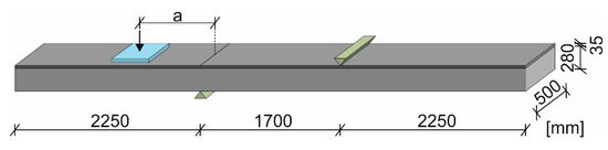 Within the scope of the load bearing tests, a truck located on a bridge’s cantilever was simulated, as shown in Figure 3b. For this purpose, the specimens were simply supported with a distance of 1.70 m between the axles of the supports. The resulting cantilevers of 2.25 m were separately loaded in two partial tests. The support that was more distant from the load was arranged at the topside of the specimen in order to counteract the lifting forces that occurred due to the test setup. The load was induced employing a hydraulic cylinder and a load distribution plate with an area of 40 × 40 cm. These measurements represent the contact surface of a wheel load according to Eurocode 1 [44]. The distance a between the center line of the load and the axis of the support according to Figure 4 was 0.7 m, 1.0 m and 1.3 m to investigate the influence of different a/d-ratios (corresponding to the shear-slenderness) within the shear tests and to vary the level of the bending moment within the flexural tests, respectively. Table 1 gives an overview over the parameters of the test program.