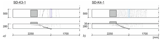 All specimens were loaded until failure. Within the shear tests, a characteristic diagonal shear crack occurred (Figure 5). At failure, the cracks opened widely. Regarding the tests on strengthened specimens, a significantly larger number of bending cracks appeared, featuring smaller crack widths compared to the non-strengthened reference tests, like the crack patterns at failure of SD-K3-1 and SD-K4-1, exemplarily shown in Figure 5.