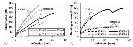 Figure 6 shows the load-deformation-curves of the tests. The deflections were measured below the center of the load application. All tests on the strengthened slab segments feature lower deformations compared to their reference tests at the same load level. Within the bending tests on the strengthened specimens, local delamination between the carbon grid and the surrounding mortar occurred. Subsequent modifications of the materials by the project partners aim to prevent this phenomenon. In the shear tests (SD-K3 and SD-K4), the increases in shear capacity were ηV,1 = 56% and ηV,2 = 23% (η = (Vu,TRC − Vu,RC)/Vu,RC), respectively. The increase in flexural capacity within the bending tests was significantly higher. The flexural strengthening rates were ηM,1 = 174% and ηM,2 = 91% (η = (Mu,CTRM − Mu,RC)/Mu,RC), respectively. Table 2 gives an overview of the test results.