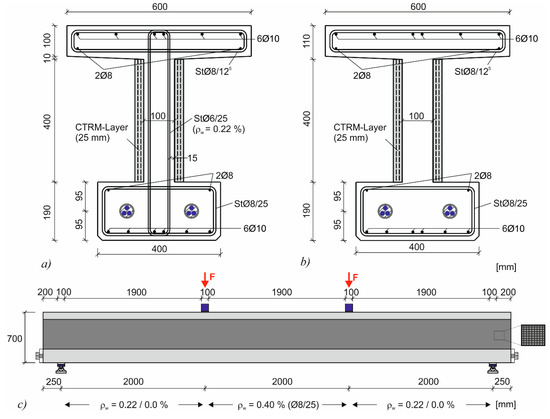 The experimental results of the strengthened test beams were compared to similar test beams from previous research projects without a CTRM layer which served as a reference [47,48]. The cross-section of the test beams had a total width of 0.6 m and a web width of 0.1 m (Figure 9a,b). The beams had a total length of 6.5 m and cross-section height of 0.7 m (Figure 9c). The point loads were located in the third points of the beam with a resulting shear slenderness of a/d = 3.3. The tests were performed on a member with a low amount of shear reinforcement (ρw = 0.22%) which was strengthened with CTRM (CTRM-M-22-7). This member was compared to identical members without strengthening (M-22-7 and M-22-3) from a previous project [48]. Another member without shear reinforcement with CTRM-strengthening was produced (CTRM-I-O-5) which was also previously tested without strengthening (I-O-5) [47]. The test beams were subjected to 1.2 to 3.1 million load cycles using different peak and valley loads. In difference to tests by other authors [42], the strengthening layer was not anchored the compression or tension chord.