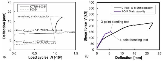 For the test beams without shear reinforcement (I-O-5 and CTRM-I-O-5) the highest load of the strengthened beam CTRM-I-O-5 was increased by 40% in comparison to the non-strengthened beam I-O-5. Nevertheless, the beam strengthened with CTRM did not show any signs of fatigue failure. In the following step, the loading was increased further so that the maximum load was almost equal to the initial shear crack load of the non-strengthened specimen I-O-5. At this level, the non-strengthened beam would have failed immediately, whereas the beam with CTRM sustained another 180,000 load cycles despite the formation of a large shear crack (Figure 11a). Although additional load cycles would have been possible, the testing was aborted at this point due to large deflections. The remaining static capacity of the specimen CTRM-I-O-5 was Vult = 233 kN, whereas the original specimen without CTRM had a remaining capacity of only Vult = 158 kN (Figure 11b).