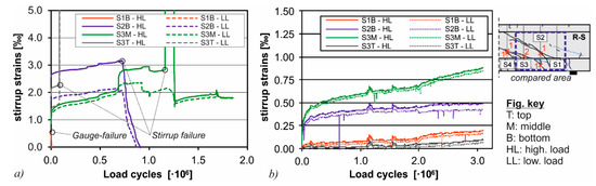 The stirrup strains of the specimens with shear reinforcement, which were measured by strain gauges, are shown in Figure 12 for specimens M-22-7 (without CTRM-strengthening) and CTRM-M-22-7. The peak load of the specimen CTRM-M-22-7 was increased by about 30% compared to the previous specimen M-22-7. In the previous experiment without CTRM-strengthening, various stirrups failed during the first 106 load cycles which can be seen from the progression of the curve in Figure 12a. In contrast, the beam strengthened with CTRM did not exhibit any damage on the stirrups after 2 × 106 load cycles, after which the amplitude was increased further (Figure 12b). After the increase of the amplitude, some stirrups failed and the deflection grew moderately. Even then, the beam was able to sustain another 1.1 × 106 load cycles after which the test was aborted. This behavior indicates a considerable load transfer over the CTRM strengthening, relieving the existing stirrups.