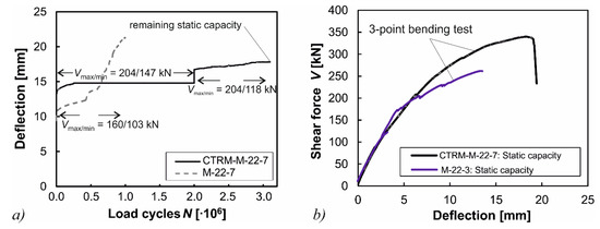 The deflections in dependence of the load cycles and the load-deflection curves under static loading are illustrated in Figure 13. The strong increase of the deflection of the non-strengthened beam M-22-7 indicates a progressive failure of stirrups during the first 106 load cycles (Figure 13a). On the other side, the strengthened specimen CTRM-M-22-7 did not show any signs of a progressive fatigue failure even after increasing the amplitude after 2.0 × 106 load cycles. The remaining capacity of the beam CTRM-M-22-7 amounted to Vult = 350 kN (Figure 13b). The remaining capacity of the original beam M-22-7 was not determined due to its considerable damage in the stirrups. However, another previous test beam M-22-3 with the same pre-stressing, but subjected to smaller highest loads, had a remaining capacity of Vult = 264 kN. It can, therefore, be seen that the CTRM strengthening had a considerable effect on the remaining shear capacity for the beams with shear reinforcement as well.