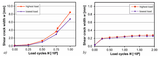 This is also indicated by the crack width measurements in the shear span made by digital image correlation (DIC). The DIC technique is frequently used in shear tests to accurately analyze the crack growth [50,51]. Here, the Aramis system (v5.4, GOM GmbH, Braunschweig, Germany) was used [52]. The shear crack widths for specimen M-22-7 dependent of the load cycles are illustrated in Figure 14a for highest and lowest loads. As can be seen, the shear crack widths increase rapidly to over 8 mm during the first 106 load cycles in correspondence with the failure of stirrups according to Figure 12a and the increase of deflections according to Figure 13a. For the strengthened specimen CTRM-M-22-7, the crack widths were measured during the first 2 × 106 load cycles (Figure 14b). The diagram, which is scaled down by one order of magnitude compared to Figure 14a, shows that the shear crack widths are considerably smaller ranging from 0.2 to 0.3 mm. Additionally, the crack widths do not increase exponentially as for the non-strengthened specimen, which illustrates the stabilizing effect of the CTRM-strengthening.