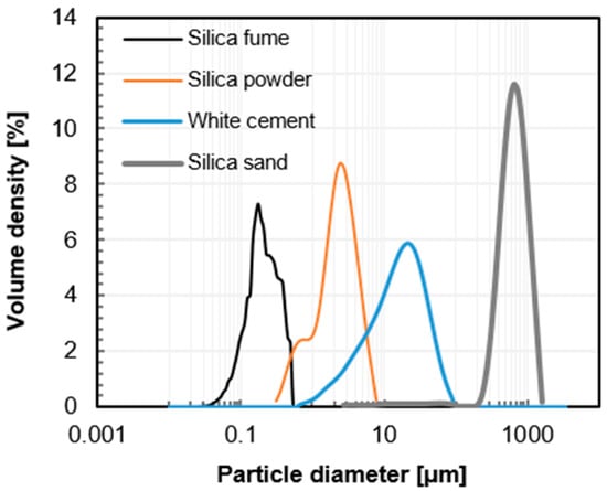 Particle size distribution of raw materials measured by an image analysis method for silica fume and a laser diffraction method for silica powder, white cement, and silica sand.