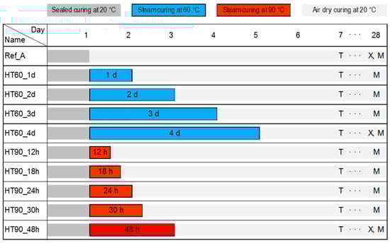 Curing and testing program of UHPC samples (T, X, and M denote the test days for Thermogravimetric Analysis (TGA), X-ray Diffraction (XRD), and mercury intrusion porosimetry (MIP), respectively).