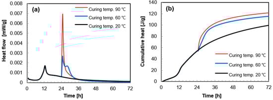 Heat flow (a) and cumulative heat (b) of UHPC cured under 20 °C, 60 °C, and 90 °C (the elevated temperature curing at 60 °C or 90 °C started from 24 h).