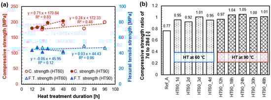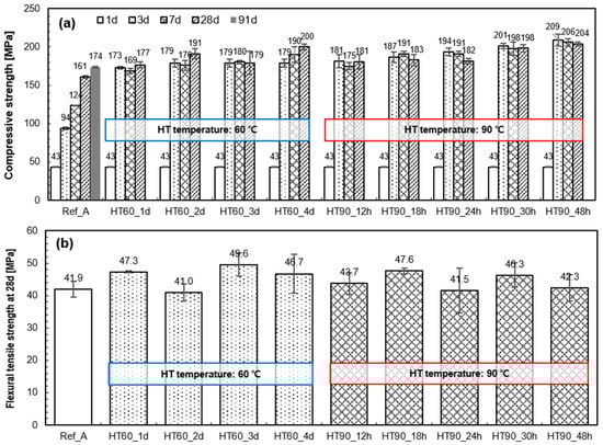 Heat treatment at high temperatures (i.e., 90 °C) ensured outstanding strength after the HT. In this case, however, there was no increase in the strength between 7 days and 28 days, but rather a slight decrease was observed. However, after the HT at low temperatures (i.e., 60 °C), the strength tended to continue to increase until 28 days. Consequently, the HT at 90 °C and 60 °C did not show a noticeable difference in the 28 day-compressive strength. Moreover, the flexural tensile strengths at 28 days of all samples were similar regardless of curing conditions.