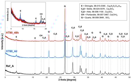 Figure 5 shows the results of XRD analysis of three samples cured for 28 days. At the main crystalline phases in UHPC, inert quartz, ettringite, unreacted cement clinkers, and portlandite are identified. The quartz peak is detected from crystalline SiO2 contained in silica powder (i.e., not from the silica sand which is excluded for the XRD test), and its intensity does not noticeably change in different curing conditions. This is because, unlike SF, silica powder is known to act as an inert filler in UHPC unless it is exposed to 150 °C or higher temperature [6,19]. In the case of the detected ettringite mineral, the HT of 60 °C did not change the peak intensity, whereas the peak almost disappeared at a HT of 90 °C. It is known that when concrete is exposed to temperatures above 70 °C, ettringite in the concrete starts to decompose [30]. In this case, expansion or damage due to delayed ettringite formation (DEF) might be considered in the later stages. Although the risk of the DEF in the case of UHPC has not been fully explained yet, the effect of DEF can be neglected in UHPC because there is no available water for later ettringite formation, especially under the HT [8].