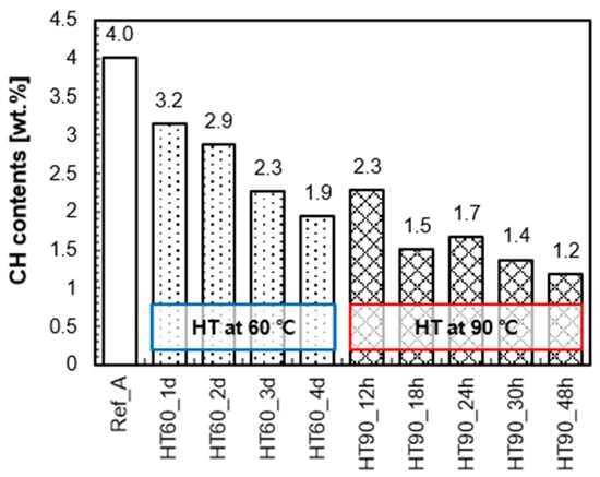 Figure 9a quantitatively shows the effect of HT temperature and duration on the portlandite content and the pozzolanic reaction. It was confirmed that the reaction is promoted by increasing HT temperature and duration. In the case of the HT at 90 °C, the rate of portlandite consumption per HT hour is 2.5 times faster compared to the HT at 60 °C. This indicates that if the HT temperature is increased from 60 °C to 90 °C, the pozzolanic reaction can be greatly accelerated for a shorter period of time. On the other hand, if the temperature has to be reduced from 90 °C to 60 °C (e.g., due to curing equipment limitations), the duration should be longer to assure a pozzolanic reaction of the same degree.
