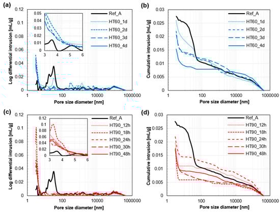Pore size distribution of UHPC at 28 days: Log differential intrusions (a) and cumulative pore volume (b) of Ref_A and HT_60 series. Log differential intrusions (c) and cumulative pore volume (d) of Ref_A and HT_90 series.