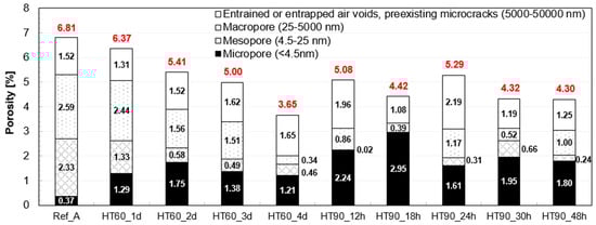 Figure 8 shows the porosity of the samples, which is divided into four ranges based on pore diameter [22,23]. The total porosity was reduced by the HT at 60 °C, and this became more prominent as it cured longer. Only pores below 5 μm contributed to this reduction, and as mentioned previously, the volume of the entrained or entrapped air voids did not vary according to the HT. In all heat-treated samples, the volumes of micropores and mesopores significantly changed to increase and decrease, respectively. The HT at 90 °C was also effective in reducing the total porosity, but its long duration did not always lead to a lower total porosity. In other words, there was no significant decrease in the total porosity when the HT duration was longer than 18 h. Compared to the HT at 60 °C, the HT at 90 °C made the pore structure much finer especially below 25 nm. Thus, the fraction of micropore volume of the HT_90 series is particularly high.