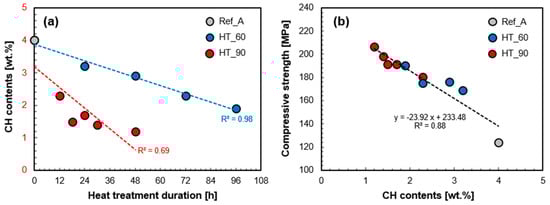 The pozzolanic reaction plays a crucial role in early strength development of the UHPC [7,31,38]. Thus, the accelerated pozzolanic reaction by HT is a major factor for enhancing compressive strength at an early stage such as 7 days [6]. This is clearly demonstrated in Figure 9b; there is a linear correlation between portlandite content and compressive strength at 7 days. This result supports the fact that the initial strength increased as HT temperature and duration increased, is mostly due to the acceleration of the pozzolanic reaction. Based on this correlation, the ultimate strength of about 233 MPa can be predicted if the pozzolanic reaction is entirely progressed and all portlandite is consumed. On the other hand, a drop of compressive strength of about 24 MPa can be expected when the portlandite content is increased by 1%. Thus, another important implication from Figure 9b is that engineers or researchers may predict the long-term strength of a UHPC structure accurately at any time within its life-span, by measuring portlandite content. Additionally, other factors which can affect long-term strength such as microcracks due to shrinkage or deterioration of durability due to ion penetration can be safely ignored in UHPC. It is previously known that both shrinkage and chloride permeability of UHPC after HT are negligibly small [1,2,3,39].