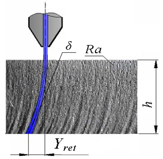 The deformation region is given by the roughness value Ra0 at the depth level of the so-called neutral plane h0 of the studied material. The pressure component of the surface deformation Rarz is determined by the Equation (18) and the tensile component Raret according to Equation (19). The intersection of the deformation components Rarz and Raret sets the Ra0 value.