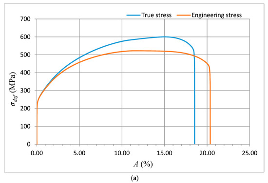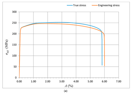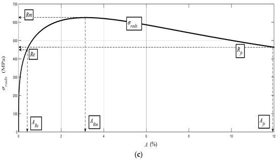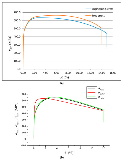 (a) Deformational diagram from the tensile test for the steel grade S355J0 for the dependence σdef = f (A); (b) Comparison of results (σrzxE, σdefM, σradx) = f (A) for the steel grade S355J0; Stresses σrzxE and σradx were derived analytically, and σdefM is obtained from the tensile test; (c) Analytical deformational diagram for the steel grade S355J0 for the dependence σradx = f (A); comparing diagram.