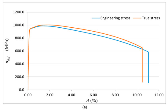 (a) Deformational diagram for the steel grade 15230QT for the dependence σdef = f (A) from tensile test; (b) Comparison diagram for the steel grade 15230QT; analytical construction of the dependence σdef = f (A).