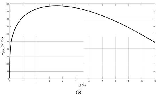 (a) Deformational diagram for the steel grade AISI 316/316L, for the dependence σdef = f (A) from tensile test; (b) Comparison diagram of the steel grade AISI 316/316L; analytical construction of dependence σdef = f (A).