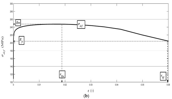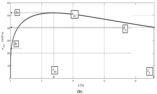 Examples of diagrams with the analytical identification of the parameters of the upper and lower yield strength are shown in Figure 10, Figure 11, Figure 12, Figure 13 and Figure 14. The identification of the upper and lower yield strength is performed by the above given Equations (22)–(24) for parameters σrzq, ε, and σc. A verification of this method can be carried out in four basic ways: (a) checking by the results of tensile tests; (b) checking by material data sheets; (c) checking by tables; and (d) checking by the roughness measurements of Ra and Rad on cuts using flexible cutting tools of abrasive waterjet.