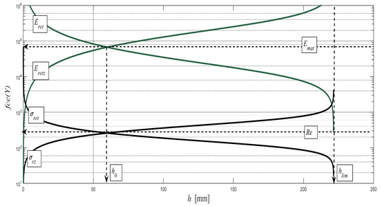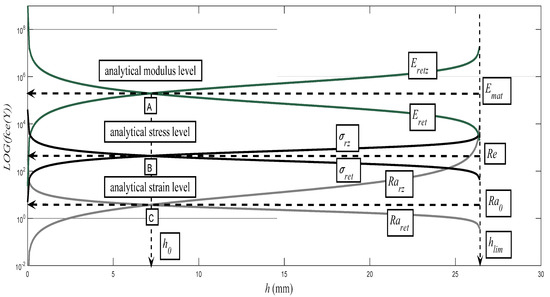 Steel S355J0, Emat = 194.5 GPa, analytical derivation of the position of the yield point Re, including the position of the neutral plane h0, the value Re being read from the σrz curve at the level h0, i.e., Re = σrz0; the yield point Re is defined by the intersection of the curves for the pressure and tensile stress components σrz and σret. At this intersection at the neutral depth, h0 applies Re = σrz0 = σret0. (Components Eretz, Eret of analytical modulus level are marked green color, components of analytical stress level σrz, σret are marked black color, components of analytical strain level Rarz, Raret are marked gray color).