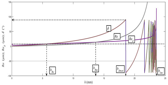 Topography functions (Ra, Rad, δ) = f (h) for AISI 309 [8], Ra (gray color), Rad (purple color), and δ (brick color).