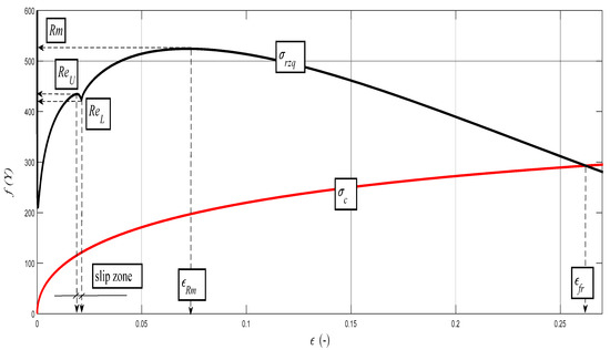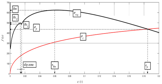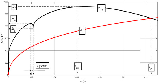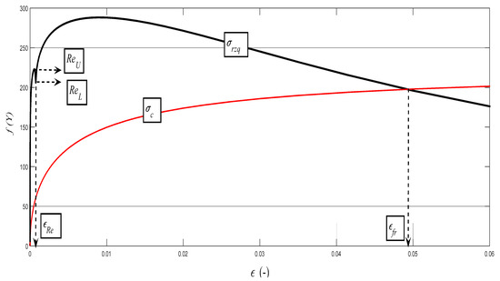 Analytical deformability diagram for the aluminium alloy AW6082T6 for the dependence σrzq = f (ε); detail for ReU and ReL. σrzq (black color) and σc (red color).