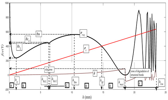 The graph in Figure 14 represents the backward reconstruction of the cut and it expresses the theoretical dependence of the distribution of the deformation stress σrzq = f (h) on the entire cut depth. Here, in addition to the positions of the principal stress–strain limits, qualitative changes in the character of distribution can be observed as well, namely according to the specific deformation zones A to F, which can be defined as follows: