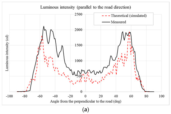 (a) Comparison between theoretical (simulated) and measured data of the luminous intensity parallel to the road direction; (b) comparison between theoretical (simulated) and measured data of the luminous intensity perpendicular to the road direction.