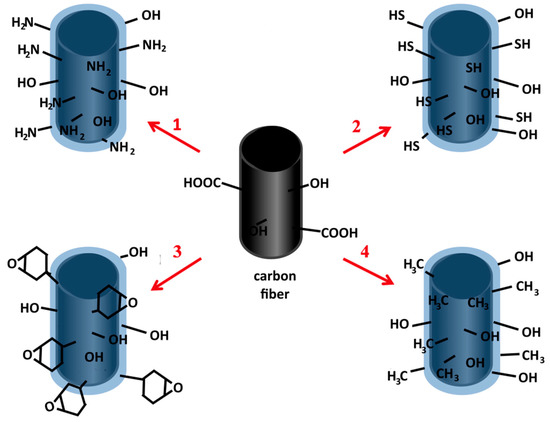 The crucial role in the creation of both types of interactions is played by functional groups. However, carbon fibers, being composed of carbon, except for very few functional groups which can arise through the oxidation of carbon, are chemically inert, which makes the formation of interfacial strength difficult. Carbon fibers, being composed of carbon, exhibit non-polar characteristics. They do, however, contain an amount of oxygen bonded with carbon in the form of carbonyl, oxide, hydroxyl, and even carboxyl functional groups. These groups are beneficial for the wettability of carbon fibers by epoxy resins and their hardeners, as well as for the emergence of interphase adhesive bonds. The number of these groups is, however, insufficient, so carbon fibers are subjected to surface treatment [5]. There are many methods of improving their adhesion properties, e.g., plasma treatment [6], coronal discharge [5], heat treatment [3], electrochemical treatment [7], oxidizing with nitrous acid (HNO3) [5], coatings deposition [2,8]. The adhesion between the coating and carbon fibers is very important for the cohesion of composite products, but due to the small thickness of coating (in the case described in this paper less than 50 nm) direct measurements of its adhesion to the fiber are difficult mainly because of the measurement resolution of the equipment. Typically, such measurements are carried out on samples of the target composite material (i.e., fibers + coating + matrix). However, this stage of research was not the purpose of this publication.