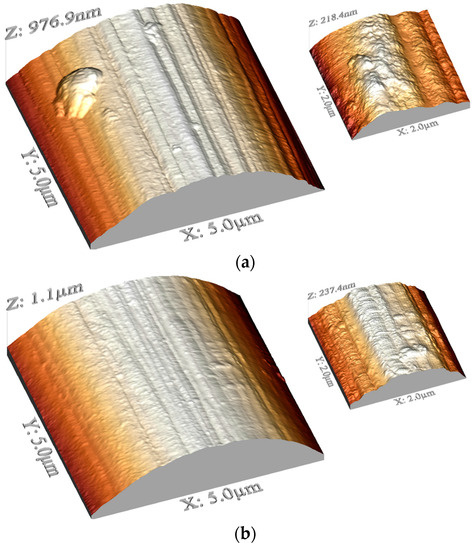 The surface topography of uncoated and coated carbon fibers was measured with an atomic force microscope (AFM) dimension scanning probe microscope (Veeco-Bruker, Billerica, MA, USA) at the Advanced Materials Engineering and Modelling Group, Wroclaw University of Science and Technology. During the investigations the tapping mode was used. The following scan sizes were used: 5 µm × 5 µm, 2 µm × 2 µm, and 1 µm × 1 µm. The data were compiled using WSxM [37].