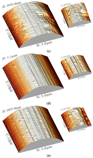 AFM images of uncoated and coated carbon fibers in 3D mode: carbon fibers without coating (a); and carbon fibers modified with coating 1 (b); coating 2 (c); coating 3 (d); and coating 4 (e).