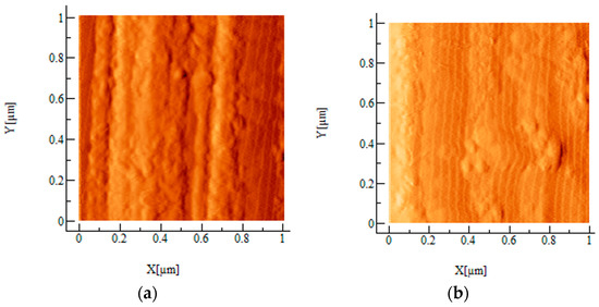 AFM examinations revealed changes in the topography of carbon fibers after coating application. The topographic 3-D profiles of fibers in the area 5 μm × 5 μm and 2 μm × 2 μm are presented in Figure 3. All fibers reveal the presence of grooves along the length of fibers, which is characteristic of carbon fibers made by carbonizing a precursor material (usually poly (acryl nitrile)). In the case of fibers coated with coating 2, grooves are the least distinct, which can be caused by the texture of this coating. The roughness of fibers with coating 1 and 3 is similar to uncoated fibers, in other cases fibers after modification are apparently rougher. Greater roughness is manifested by a higher surface area, so also by more potential sites for interactions, which should result in improved adhesion. To show the topography in higher magnification, 2-D images in a derivative mode in the area 1 μm × 1 μm are presented in Figure 4.