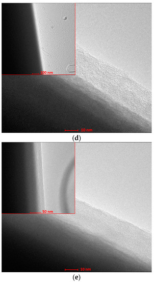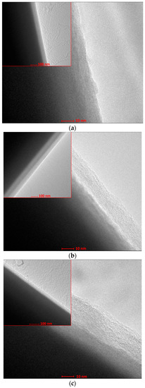 To confirm the presence of thin silica layers on the coated carbon fibers, examinations with a high-resolution transmission electron microscope (TEM) Tecnai G2 20 X-TWIN (FEI, Hillsboro, OR, USA), equipped with an EDS detector, were performed at the Laboratory of Electron Microscopy, University of Wroclaw. Based on the taken micrographs, the thickness of coatings was estimated. The thickness measurement was made at 15 areas for each type of coating.